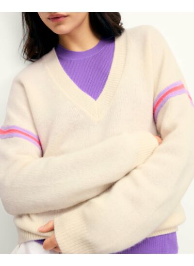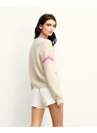 Confectionné en cachemire 4 fils, ce pull se distingue par des bandes bicolores aux manches, signatures de l'allure From Future. Un col V et des bords côtelés soulignent sa coupe courte. À mixer avec une jupe fluide ou un pantalon structuré.