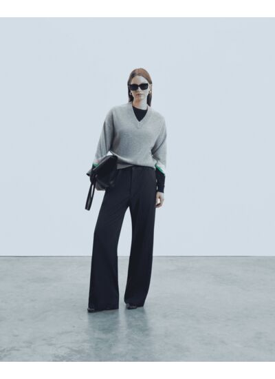 Ce pull en cachemire se distingue par un décolleté en V, orné de surpiqûres contrastées, et de bandes tricolores. Muni de manches longues et de bords côtelés, il dévoile une silhouette structurée avec une touche d'audace.