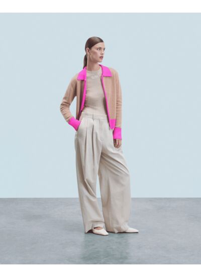 Twistez votre silhouette de saison avec ce pull gilet court confectionné en cachemire. Mêlant style et audace, des bords contrastés réhaussent le col, la fermeture zippée et les poignets. Associez-le à un jean décontracté ou un pantalon structurée pour un look chic et casual.