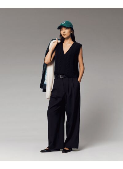 Confectionné en cachemire 6 fils, ce pull sans manche infiniment doux s'impose comme un incontournable de la saison. Court et oversize, il dévoile un col rond et un jeu de torsades qui capturent l'élégance intemporelle, vous invitant à embrasser un style qui transcende les époques. À porter seul ou sur une chemise, agrémentez votre silhouette avec un pantalon fluide pour une allure élégante et casual.