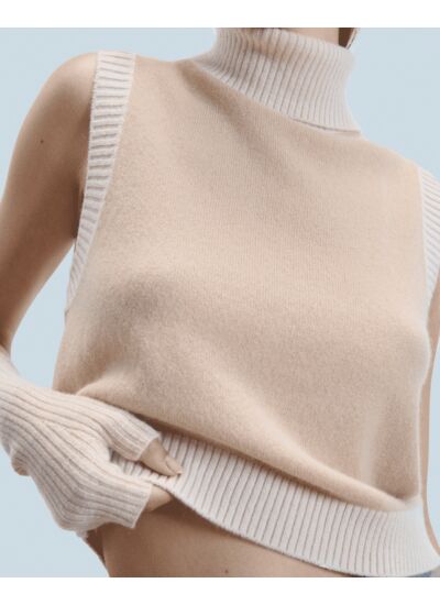 Confectionné en cachemire, ce pull sans manches court se pare d'un jeu de contrastes pour une élégance décontractée. Mêlant douceur et audace, il arbore un col roulé et des bords côtelés contrastés. Associez-le à une chemise fluide et un pantalon ample pour un look sophistiqué.