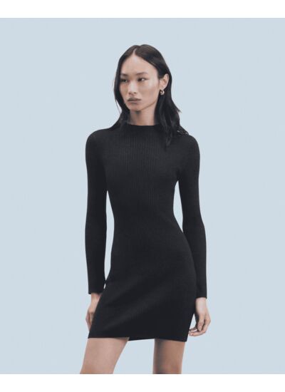 L'indispensable robe courte du vestiaire féminin est revisitée dans une version ajustée en maille côtelée et métallisée. En laine mérinos certifiée RWS (Responsible Wool Standard) et en lurex, elle dévoile un col rond et des manches longues. Élégante et intemporelle, accessoirisez-la avec des escarpins ou des sneakers.
