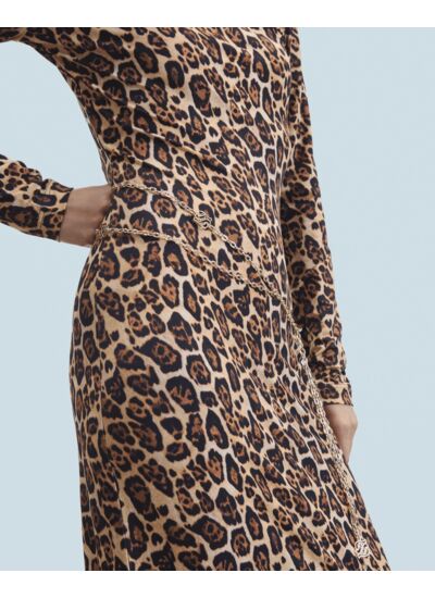 La silhouette est élancée et les volumes sont revisités avec cette robe ornée d'un imprimé léopard. Dotée d'un col rond et des manches longues, elle séduit par une jupe évasée délicatement fendue. À porter comme une seconde peau, agrémentez-là d'une paire d'escarpins pour une tenue sophistiquée ou de sneakers pour un look casual.
