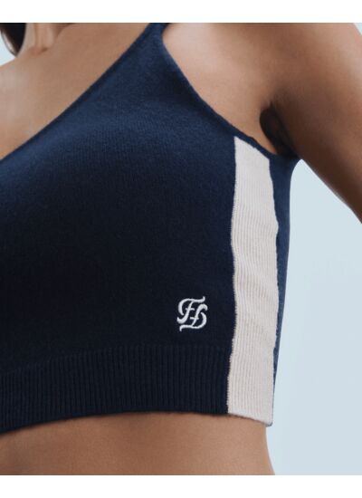 Confectionné en cachemire 2 fils, ce top court et ajusté dévoile une silhouette audacieuse, accentuée d'un décolleté en V et de bandes contrastées sur les côtés. Muni de bretelles fines, une broderie signature FF s'invite à l'avant. À porter comme une seconde peau, mixez-le à un jogging décontracté ou un pantalon de tailleur structuré.