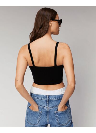 Effet seconde peau et coupe ajustée pour ce top brassière en maille côtelée. Muni de fines bretelles, il dévoile un décolleté cœur. Essentiel du vestiaire féminin, il se porte seul ou en superposition.