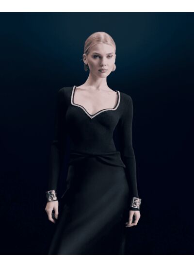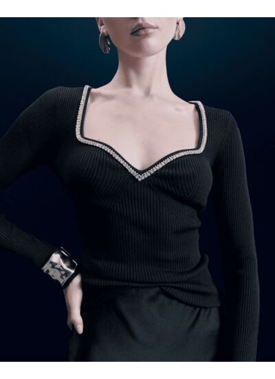 Un décolleté cœur, bordé de strass étincelants, illumine ce top à manches longues. Confectionné en laine mérinos certifiée RWS (Responsible Wool Standard), sa maille côtelée et ajustée épouse la silhouette avec élégance. Parfaites pour vos tenues de soirées, associez-là à une jupe satinée et une paire d’escarpins.