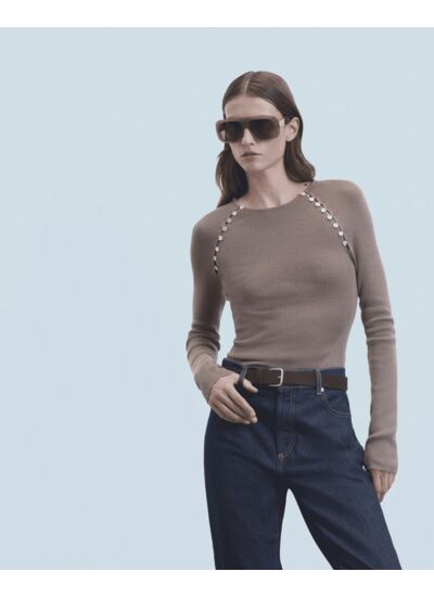 Confectionné en 100% laine mérinos certifiée RWS (Responsible Wool Standard), ce top côtelé dévoile un col rond et des manches longues raglan. Rehaussé de délicats boutons nacrés, il incarne l'élégance intemporelle. Structurez votre silhouette en l'associant à une jupe courte ou un pantalon de tailleur.