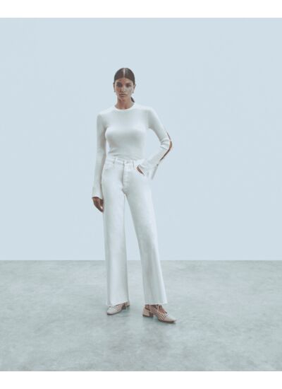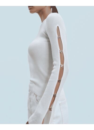 Une maille moelleuse et ultra aérée s'invite sur ce top ajusté, confectionné en laine mérinos certifiée RWS (Responsible Wool Standard). Avec son col rond côtelé, elle dévoile des découpes audacieuses le long des manches, ornées de bijoux signatures dorés Future. Pièce élégante et affirmée, elle s'associe à une jupe fluide pour un look résolument chic.