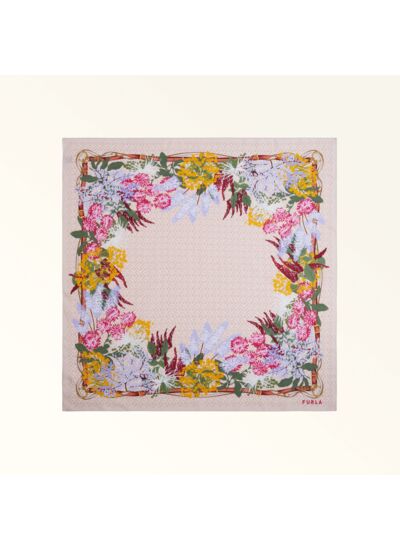 Composition : 100% SEM. Dimensions : 90 x 90 cm. Tissage : twill de soie. Motif : Spring Frame. Marque : Furla.