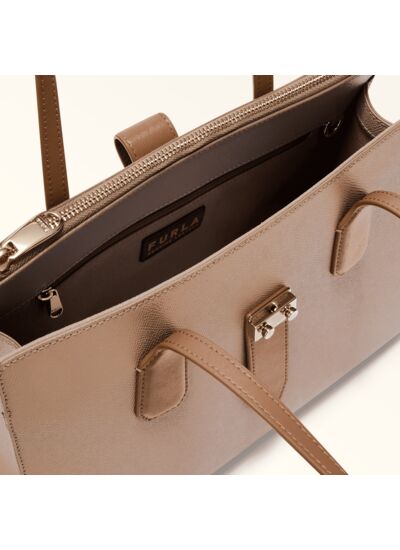 Réponse : Ce modèle spécifique est proposé en cuir Vitello Andromeda et Vitello Sidney, aux teintes exclusives Furla.