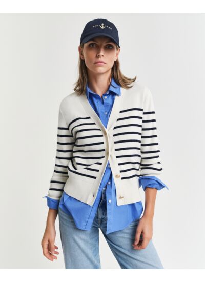 Découvrez le cardigan en coton rayé de la marque GANT, un incontournable de votre garde-robe féminine. Ce pull en maille est conçu pour allier confort et élégance, tout en apportant une touche de style à vos tenues. Fabriqué en coton de haute qualité, il offre une douceur exceptionnelle et une respirabilité optimale, idéal pour les journées fraîches ou les soirées d'été.