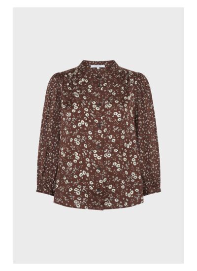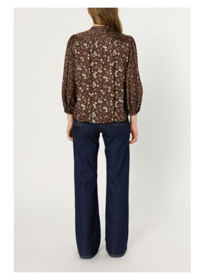 Chemise à petites fleurs beige sur fond bleu marron, confectionnée dans une matière satinée au tomber fluide. A porter en toutes occasions, au bureau ou de manière plus décontractée.