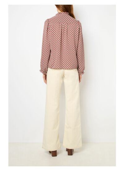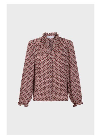 Chemise avec un imprimé pâquerettes bicolore. Col montant à volants dans un esprit romantique chic.