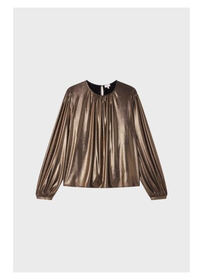 Quels détails de style caractérisent cette chemise ? Elle affiche des fronces aux épaules et au niveau du col rond, ajoutant du volume et du caractère à ce top à manches longues.