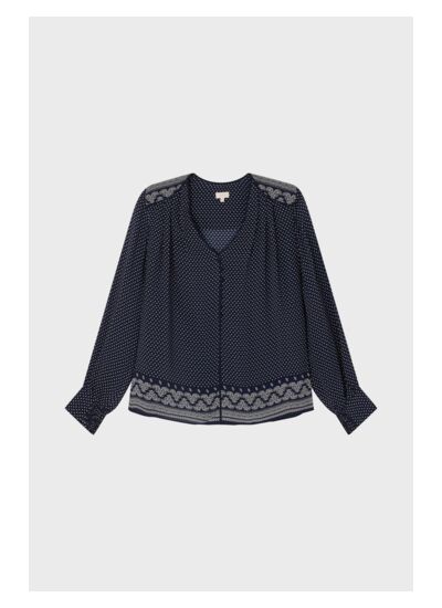 Blouse fluide avec un imprimé écru sur fond marine. Matière au toucher soyeux.
