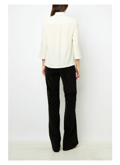 Cette blouse en crêpe fluide convient-elle à toutes les morphologies ? Oui, sa coupe fluide et son col chemise apportent une silhouette élégante et confortable, adaptée à la plupart des morphologies. Le zip doré à l'encolure ajoute une touche moderne tout en facilitant l’enfilage.