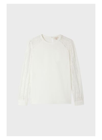 Top en crêpe et manches en dentelle pour une silhouette romantique chic.