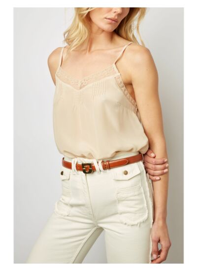 Top à fines bretelles en 100% soie et dentelle, dans un esprit lingerie chic.