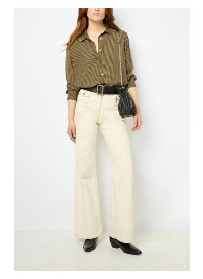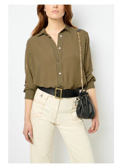 Chemise à rayures contrastées beiges et noires. Matière fluide au toucher soyeux.