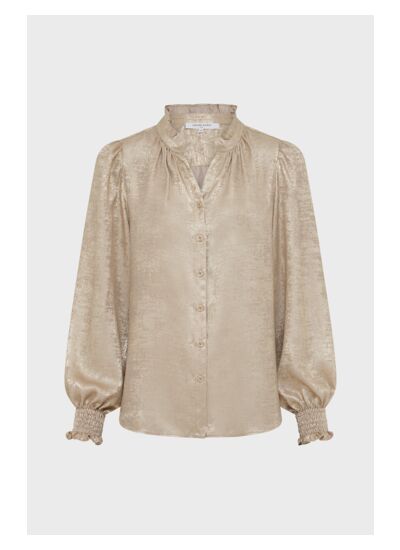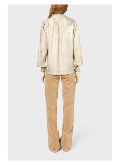 Élevez votre style avec cette chemise dorée, parfaite pour illuminer vos soirées festives. Sa forme droite et son tissu uni à l'aspect flammé apportent une touche d'élégance et de sophistication à votre garde-robe. Le col montant à volants et les manches longues avec bas élastiqués ajoutent une note romantique, tandis que les plis aux épaules et l'empiècement dans le dos garantissent un ajustement flatteur et confortable.