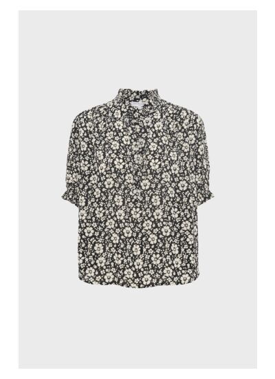 Blouse à fleurs bicolores dans une matière à l'aspect soyeux. Col montant et volants dans un esprit romantique chic.