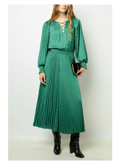 Comment entretenir la jupe en satin plissé ? Pour préserver la qualité du satin et la forme plissée, il est recommandé de suivre les instructions d’entretien indiquées sur l’étiquette, généralement un lavage délicat à la main ou en machine à basse température.