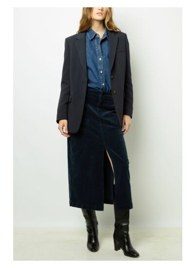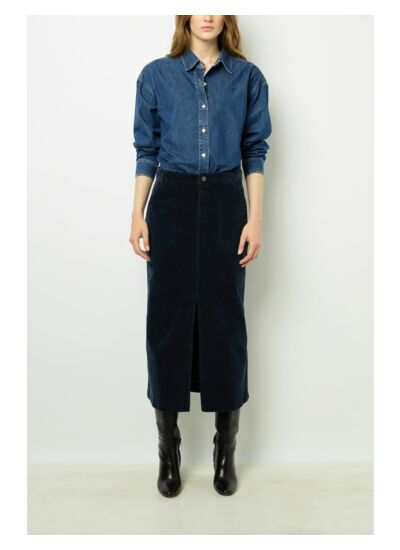 Adoptez un style à la fois élégant et décontracté avec cette jupe midi en velours à côtes. Sa forme droite et sa matière stretch vous garantissent un confort optimal tout au long de la journée, tout en mettant en valeur votre silhouette. La jupe, dotée d'une fermeture avec un bouton gravé et d'un zip sous patte, allie praticité et sophistication. Les deux poches italiennes à l'avant et les poches plates au dos ajoutent une touche fonctionnelle sans compromettre le style.