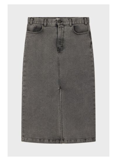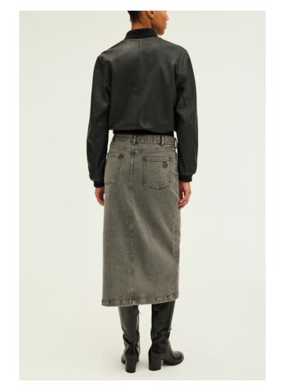 Jupe midi droite en denim anthracite. A mixer avec du cuir pour une silhouette rock.
