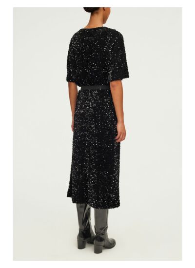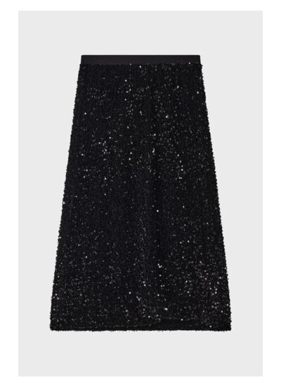 Jupe mi-longue brodée de sequins noirs pour un look sophistiqué.