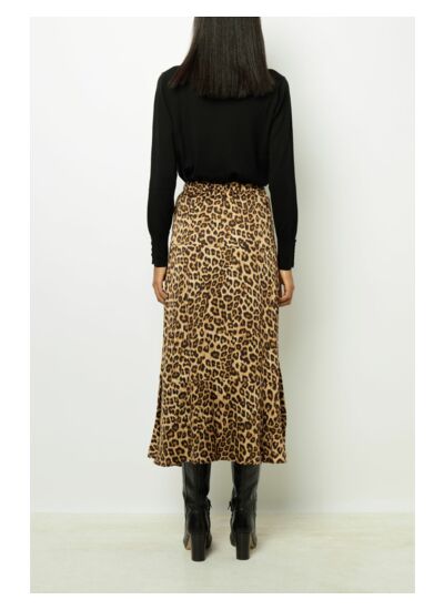 Jupe midi satinée dans un imprimé léopard pour un esprit délicieusement vintage. A porter sophistiquée ou plus casual avec un pull en laine et des bottes.