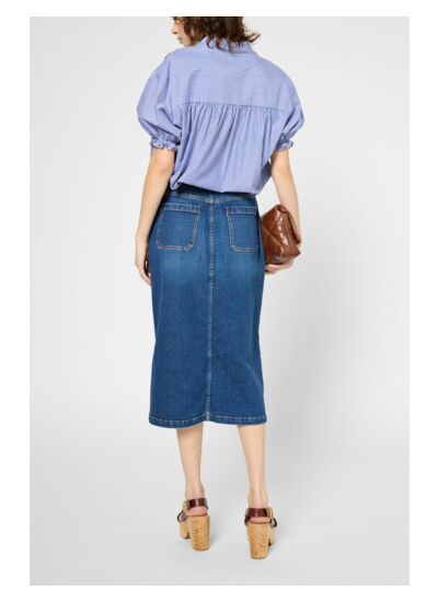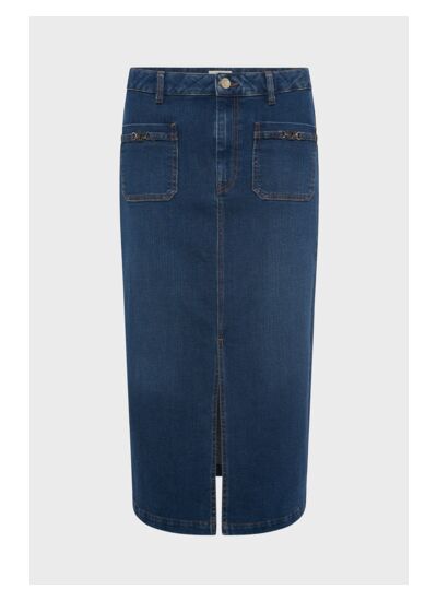 Jupe droite mi-longue en denim brut, aux poches ornées d'une boucle GD. A porter dans un esprit casual ou sophistiqué avec une chemise et des talons.