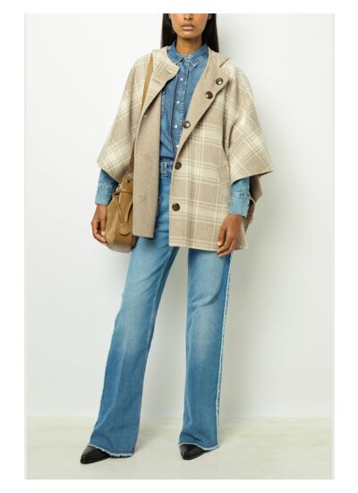 Ce manteau est-il adapté à toutes les saisons ? Cette cape en laine mélangée est idéale pour l’automne et l’hiver grâce à sa matière majoritairement en laine qui apporte chaleur et confort tout en restant légère. Comment fonctionne la réversibilité de la cape ? La cape se porte des deux côtés : un motif à carreaux pour un style affirmé, et une laine unie pour une allure plus sobre. Les boutons ronds esprit corne assurent une fermeture sécurisée et élégante des deux côtés. Quelle taille choisir et comment est la coupe ? La cape est proposée en taille unique avec une coupe ample et courte, conçue pour s’adapter à différentes morphologies. La mannequin mesure 174 cm et porte cette taille, offrant un tombé fluide et confortable. Comment entretenir cette cape en laine ? Pour préserver la qualité de la laine et la structure de la cape, il est recommandé de suivre les instructions d’entretien indiquées sur l’étiquette, généralement un nettoyage à sec professionnel. Quels sont les détails pratiques pour le port au quotidien ? La cape dispose d’un col montant à capuche pour protéger du vent, de manches chauve-souris pour une liberté de mouvement, et de poches passepoilées ou plates selon le côté porté, alliant style et fonctionnalité.