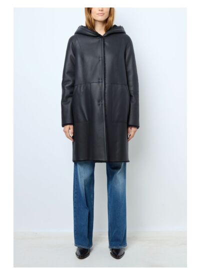 Manteau réversible à capuche en peau lainée, à porter côté peau ou côté laine. 100% cuir d'agneau au toucher très doux.