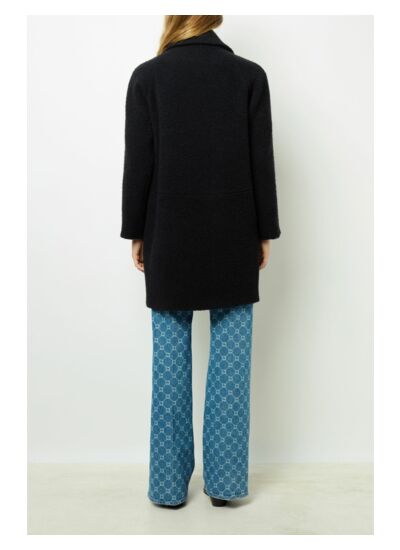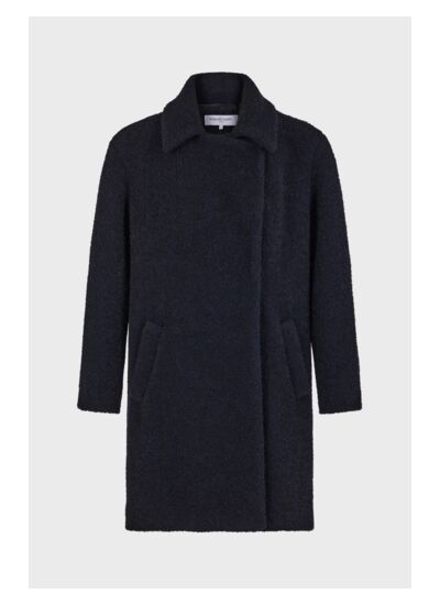 Manteau mi-long et ample en bouclette pour un look plein hiver.