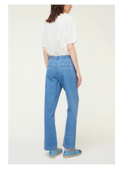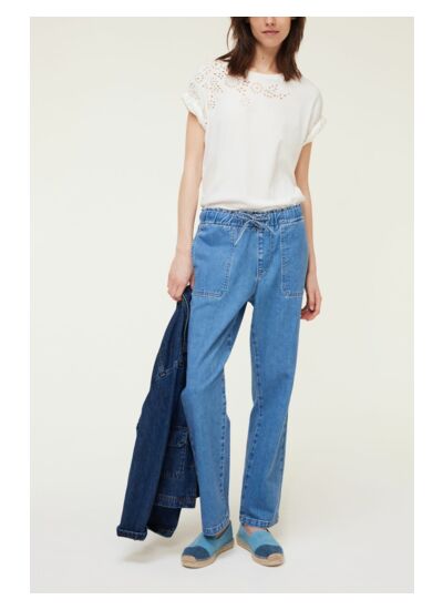 Jean droit à la taille élastiquée et lien de serrage. 100% coton.