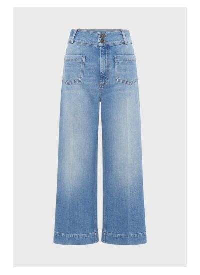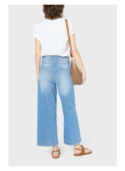 Adoptez un style intemporel avec ce jean sailor bleu ciel, parfait pour sublimer votre silhouette. Sa taille haute et sa coupe évasée au bas des jambes offrent un confort inégalé tout en mettant en valeur vos courbes. Confectionné en denim uni, ce modèle 7/8 est idéal pour les journées ensoleillées ou les soirées décontractées. Les poches plates en pointe à l'avant et les poches passepoilées au dos ajoutent une touche d'élégance pratique, tandis que les surpiqûres contrastées apportent une note de modernité.