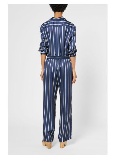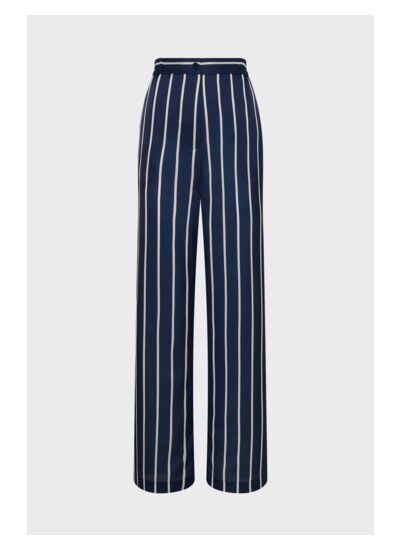 Pantalon satiné à rayures contrastées blanches sur fond bleu marine. Taille élastiquée pour plus de confort.