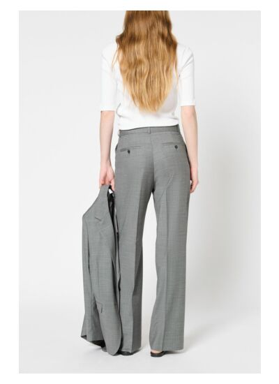 Pantalon droit avec un imprimé caviar. A porter avec la veste assortie dans un esprit tailleur. En laine vierge.