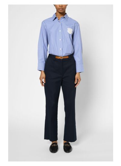 Pantalon droit en coton bleu marine au style classique chic. La taille est agrémentée d'une ceinture en simili cuir camel pour une touche de sophistication.