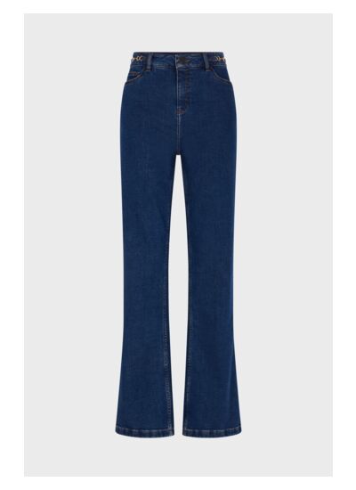 Jean bootcut à la ceinture ornée de boucles dorées.