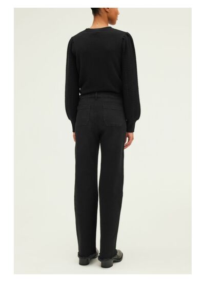Comment entretenir ce jean noir à finitions frangées ? Pour préserver la couleur et les finitions, il est conseillé de laver le jean à l’envers à basse température et d’éviter le sèche-linge. Un repassage doux est recommandé pour maintenir la qualité du tissu.
