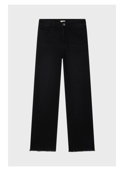 Jean droit en denim noir aux finitions frangées.