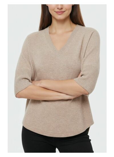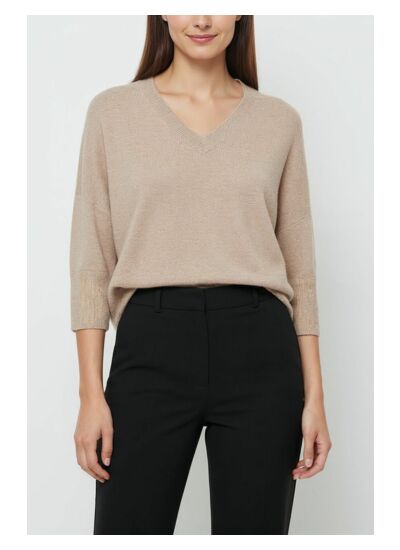Offrez-vous une touche de luxe avec ce pull en 100% cachemire, conçu pour allier confort et élégance. Sa coupe ample et son col V mettent en valeur votre silhouette tout en vous garantissant une liberté de mouvement. Disponible dans une teinte sable douce, ce pull s'intègre parfaitement dans votre garde-robe, que ce soit pour une journée au bureau ou une sortie décontractée entre amis. Les manches courtes, resserrées par un maillage en côtes, ajoutent une note moderne à ce classique intemporel.