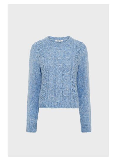 Esprit plein hiver pour ce pull en laine et angora mélangés, agrémenté de torsades, de jeux de points et d'ajourés. Il est décliné en bleu ciel chiné qui rehaussera à merveille du noir ou du bleu marine.