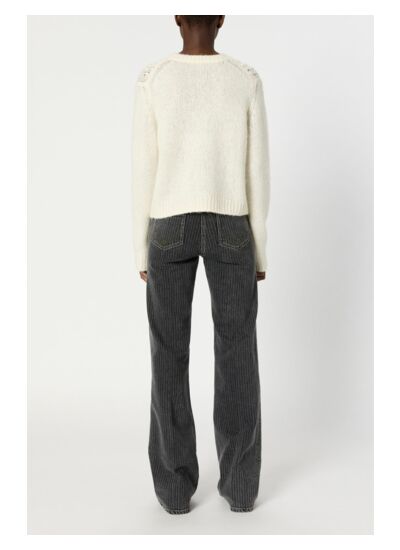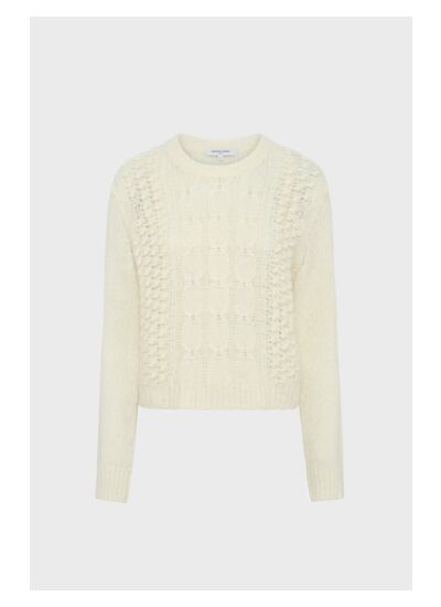 Esprit plein hiver pour ce pull en laine et angora mélangés, agrémenté de torsades, de jeux de points et d'ajourés. Il est décliné en écru, idéal à porter avec des teintes foncées mais aussi du beige ou du camel.