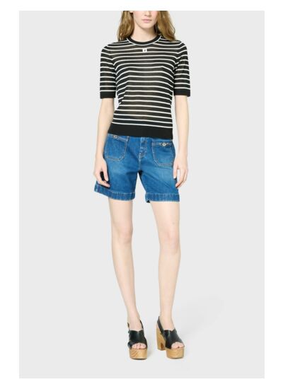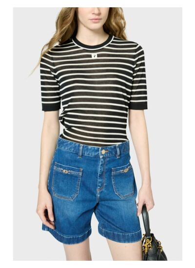 Pull fin et légèrement transparent dans un mélange contenant du coton et de la soie. Rayures contrastées dans un esprit marin.