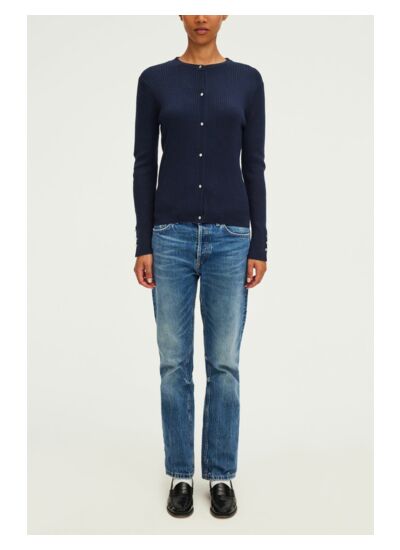 Gilet fin à côtes avec des boutons en strass. Laine mélangée. A porter en twin-set avec le pull assorti.