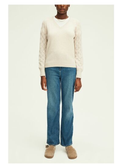 Pull V en 100% laine. Manches avec des losanges ajourés.