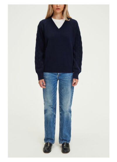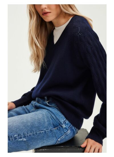 Pull V en 100% laine. Manches avec des losanges ajourés.