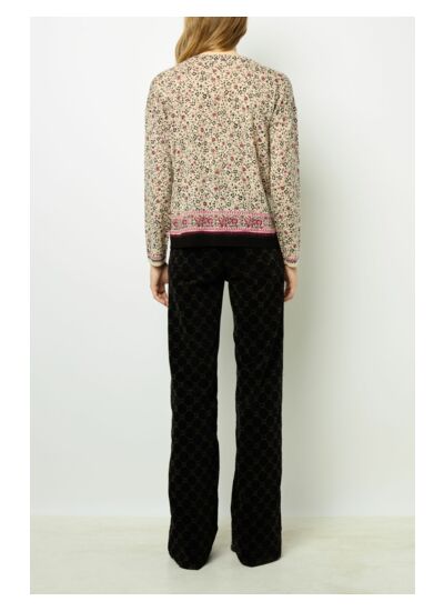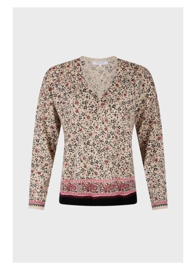 Pull imprimé fleurs en 100% laine mérinos. Encolure en V dégagée pour un porter féminin.